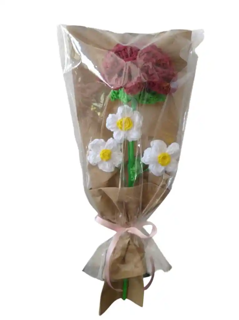 Hermosa Flor tejida a crochet 100 % a mano + 3 margaritas empacadas con su linda bolsa transparente .