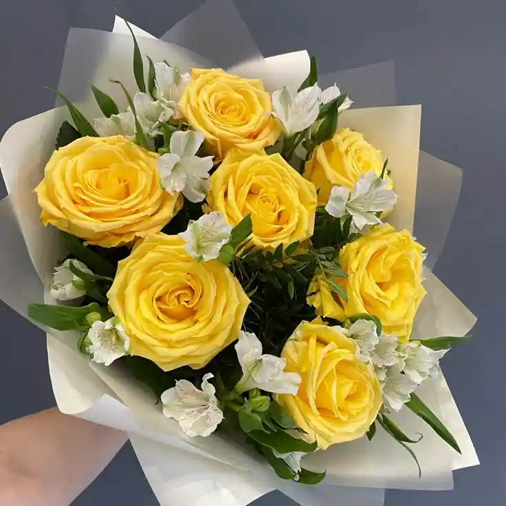 Ramo de 7 rosas amarillas mas astromelias en papel coreano