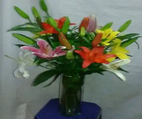 Florero de lirios de distintos colores follajes ,mas tarjeta.