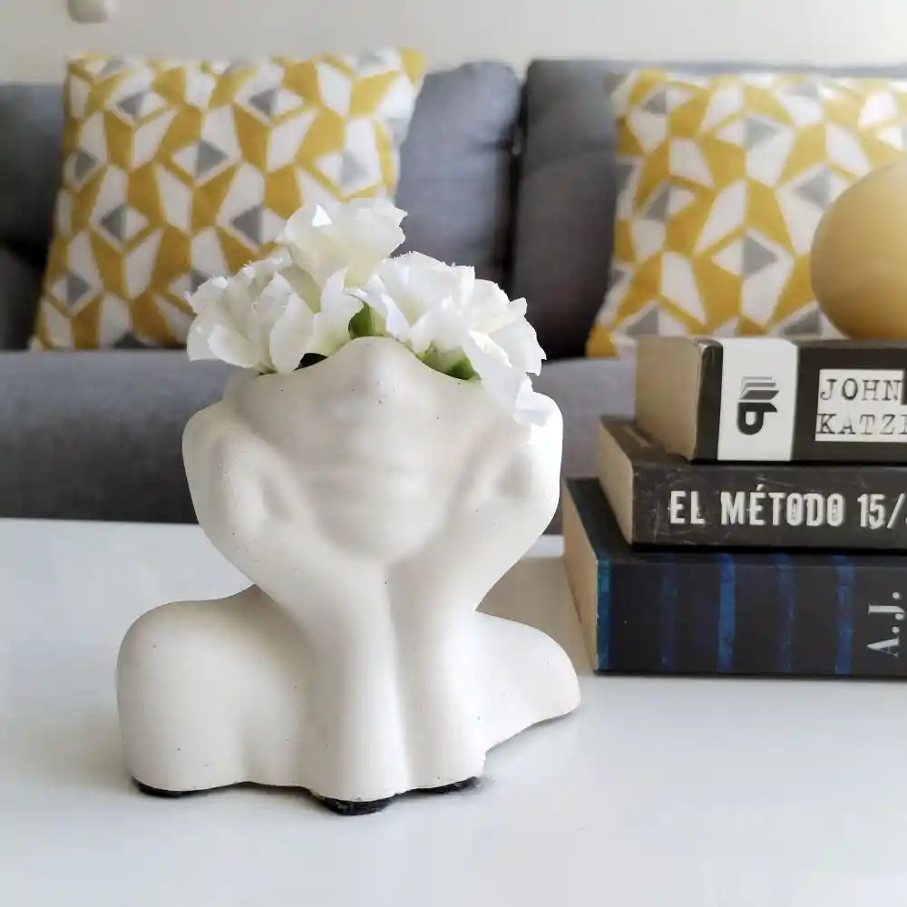 FLORERO MUJER DE CONCRETO Nuestro florero de concreto es un diseño cargado de versatilidad lo cual es nuestro plus, esta pieza refleja la delicadeza femenina, 100% en concreto y a mano reflejando el amor con el cual es fabricado; puede ser ambientado como jarrón, recipiente para maquillaje, porta lápices, en la oficina o en el hogar. Dimensiones: • Alto 9.5 cm • Ancho 11.2 cm Producto en la foto, no incluye accesorios decorativos de la fotografía. El concreto es un material en tendencia y en nuestras manos es transformado en hermosas piezas de arte moderno y diseño minimalista. Perfecto para flores inmortalizadas o naturales NUESTRA GARANTÍA: Realizar el mantenimiento del producto una vez al mes limpiando con un trapo húmedo para su limpieza en el exterior. Evite el uso de soluciones químicas, solventes o abrasivos que causan daños al producto. Las materas y artículos en cemento no tienen ningún tipo de garantía. La garantía no cubre daños causados por desgaste natural, daños causados por accidentes, alteraciones, adaptaciones, actos violentos, mal uso o mal trato. La garantía no cubre la manipulación incorrecta del producto. ADVERTENCIAS GENERALES • Ubique el producto sobre una superficie plana y bien nivelada. • No arrastre el producto para desplazarlo. • No taladre el producto. • No deje caer. Para evitar inconvenientes, es muy importante que al momento de la recepción de la compra revise el estado de los productos antes de firmar la remisión de entrega. Esto evitará inconvenientes futuros y te servirá también para hacer uso de la garantía (si la hubiera). Tu nombre, firma y número de documento al momento de la entrega se muestra en conformidad con la ley.