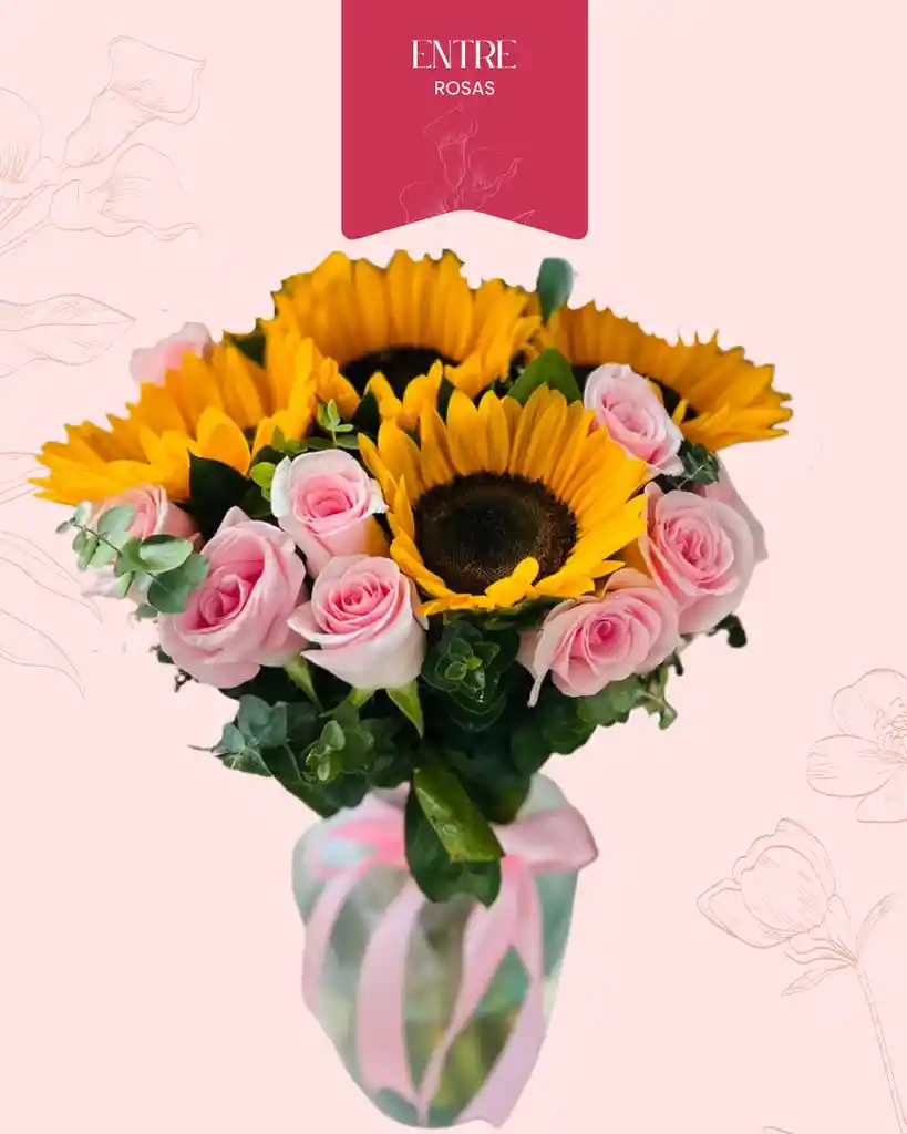 FLORERO DE 4 GIRASOLES Y 12 ROSAS Y FOLLAJES VERDES