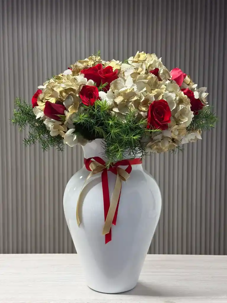 Elegante arreglo floral con rosas rojas, flores blancas con detalles dorados y follajes verdes, presentado en florero blanco de cristal con lazo decorativo. Ideal para regalar en Navidad y llenar cualquier espacio de calidez y sofisticación.
