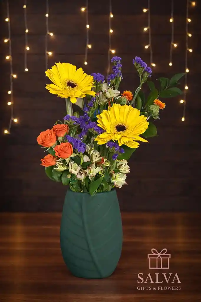 Un arreglo floral fresco, alegre y lleno de color, elaborado con gerberas naturales combinadas con otras flores y follaje decorativo, cuidadosamente dispuestas en un florero verde que aporta un estilo moderno y natural. Ideal para cumpleaños, agradecimientos, celebraciones especiales o para decorar espacios como hogar u oficina con un toque de vida y armonía. 💐 Incluye: Gerberas naturales frescas Flores mixtas de temporada Follaje decorativo Florero tipo hoja verde decorativo de lujo Diseño floral profesional Presentación lista para regalar 🌿 Ideal para: Regalos alegres y coloridos Decoración de espacios Detalles frescos y modernos 📸 Foto de referencia. La combinación de flores puede variar según disponibilidad, manteniendo siempre la calidad y el estilo.