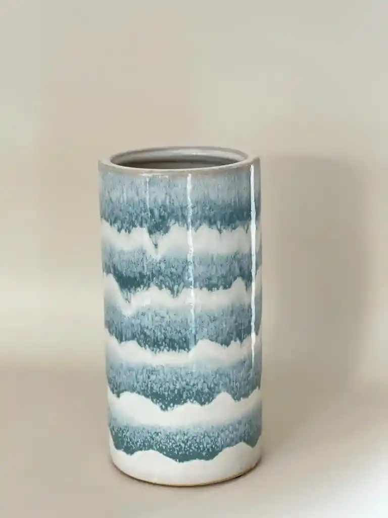 Florero en cerámica, importado, de color blanco y azul, medidas 20 cm de alto por 10 cm de boca