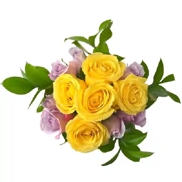 Bouquet de 12 Rosas amarillas y lilas de 40 a 50 cm Aprox. Fino Follaje y Tarjeta. Si Deseas Agregar Mensaje o...Ver más