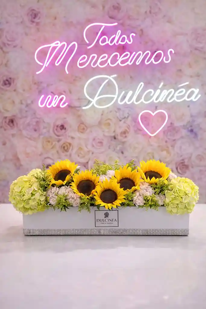 Caja de Madera, Flores Amarillas y tarjeta dedicatoria