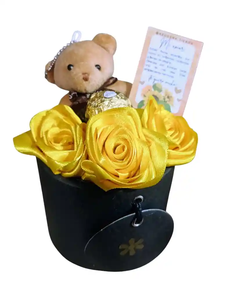 Celebra el inicio de la primavera sorprendiendo a esa persona amada con un regalo especial, esta caja contiene flores amarillas eternas, oso de peluche tipo llavero y chocolate ferrero, un regalo ideal para el 21 de marzo flores amarillas, amor, cumpleaños, aniversario, bienvenidas, nacimiento, día de la mujer, día de la madre 21 de septiembre