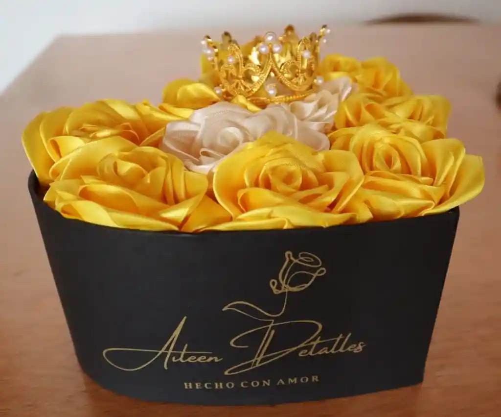 Hermoso detalle de flores amarillas y blanco perla muy elegante. Este detalle cuenta con una corona decorativa y una caja de pasta Dura.