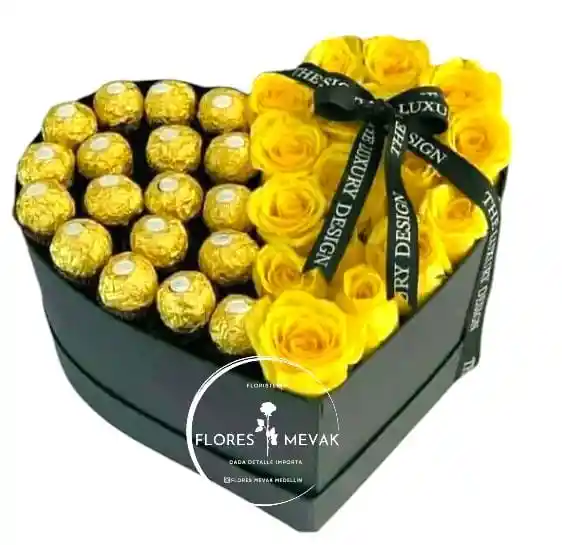 Hermoso arreglo de rosas amarillas en caja de corazón acompañadas por deliciosos chocolates Ferrero Rocher, un detalle perfecto para esa ocasión especial
