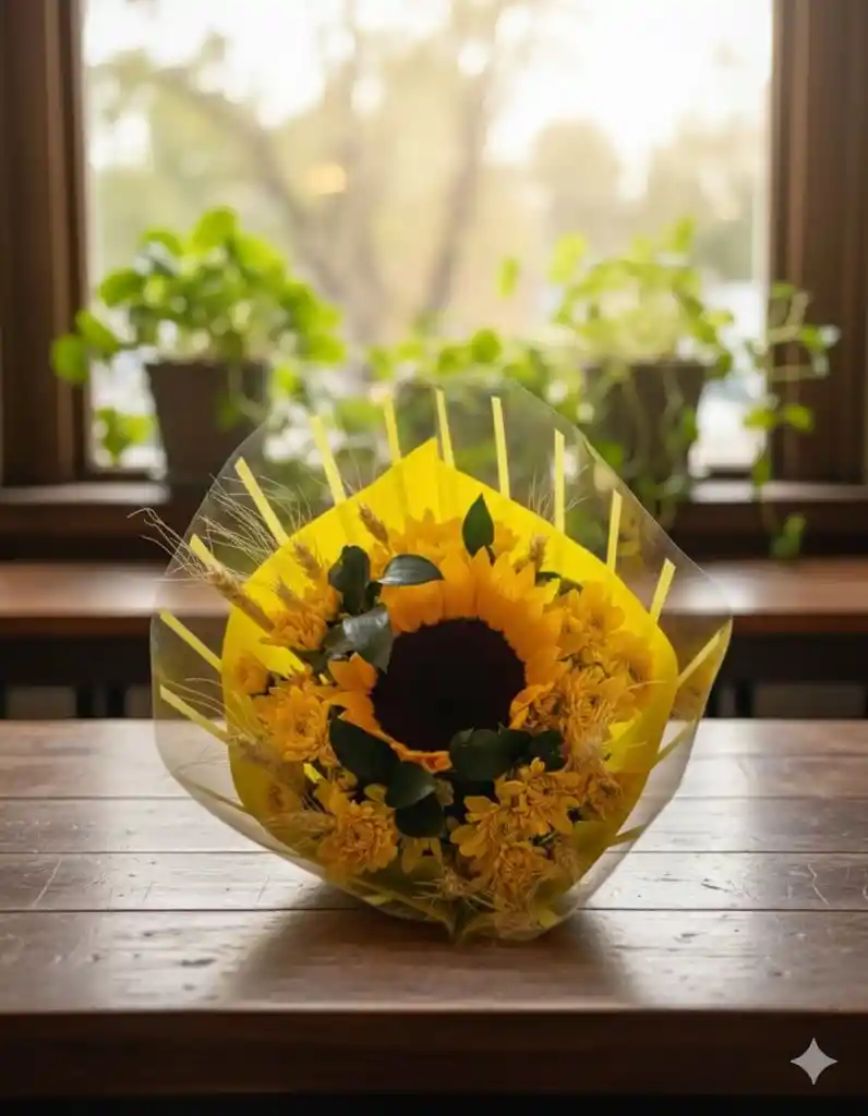 IMAGEN DE REFERENCIA: Ramo de pompon y girasol prefecto para atraer nuevas energías a tu hogar