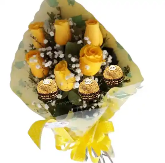 6 rosas amarillas en bouquet alargado y 3 unidades de chocolates Ferrero Rocher, con follaje, papel y moño