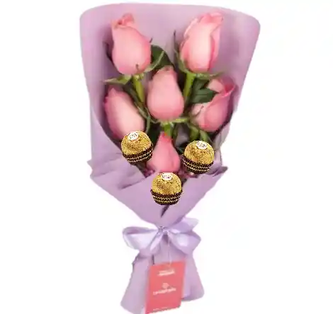 6 rosas rosadas en bouquet alargado y 3 unidades de chocolates Ferrero Rocher, con follaje, papel y moño