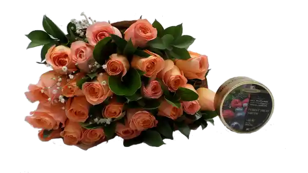 Bouquet Contiene: Rosas Tonos Salmón Seleccionadas 24 Unidades + Simpkins Dulces Importados en Caja Metálica 1 Und + Follaje 1 Und + Alimento Para Flores 1 Und. En Empaque de Regalo Ecológico Moño Decorativo y Tarjeta. Personaliza el Mensaje de la Tarjeta en Los Comentarios.