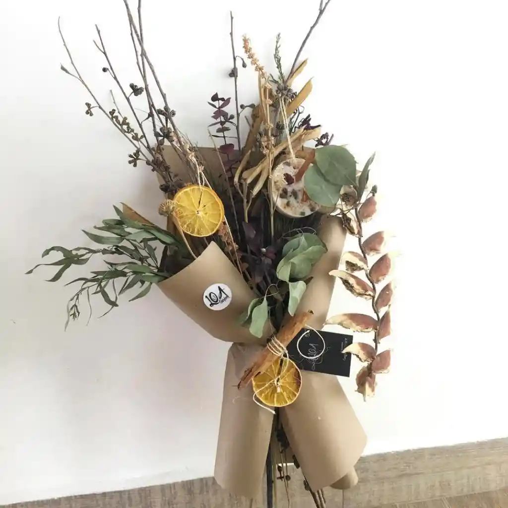 Bouquet con mix de flores secas, naranjas disecadas y un aromatizante. listo para poner en jarron. Ideal para decorar baños, salones, etc (especificar que se arma con flores secas del momento en misma gama de colores, no queda exactamente igual a la foto)