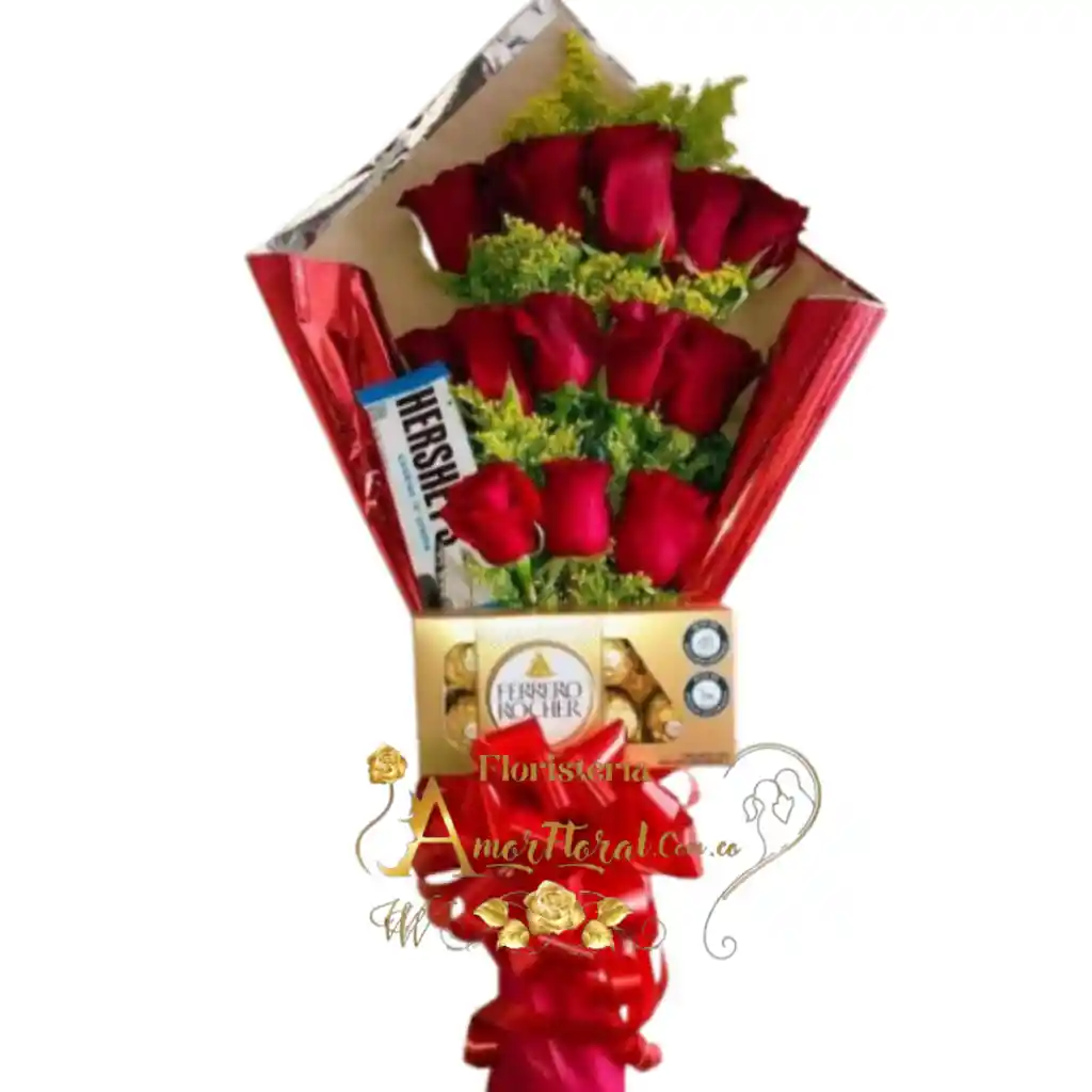 12 rosas, ferrero por 8, chocolatina, si deseas un mensaje para la tarjeta lo puedes dejar escrito en el área de observaciones o escribirnos al whatsapp al 3143111616 y enviarnos el mensaje para la tarjeta.