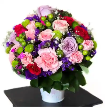 Balde de 20 centímetros con flores surtidas, mini rosas. pinoquios, siempre viva, clavellina, hipérico, yipsophilia, rusco y tarjeta