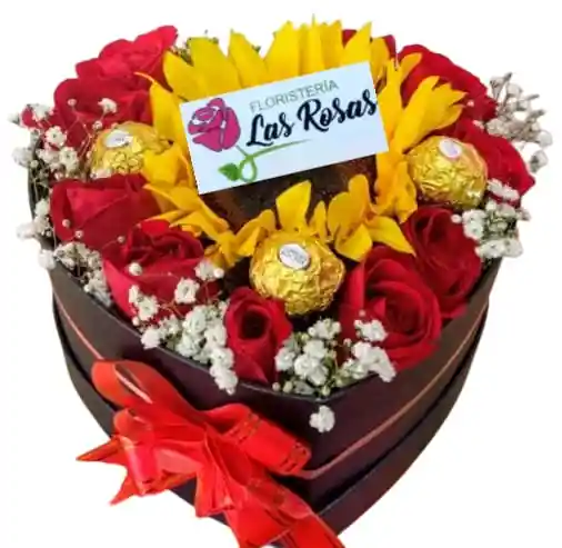 12 ROSAS ROJAS 1 GIRASOL CENTRAL 3 CHOCOLATES FERRERO CAJA DE CORAZON FOLLAJE BLANCO GIXOFILIA MOÑO Y TARJETA