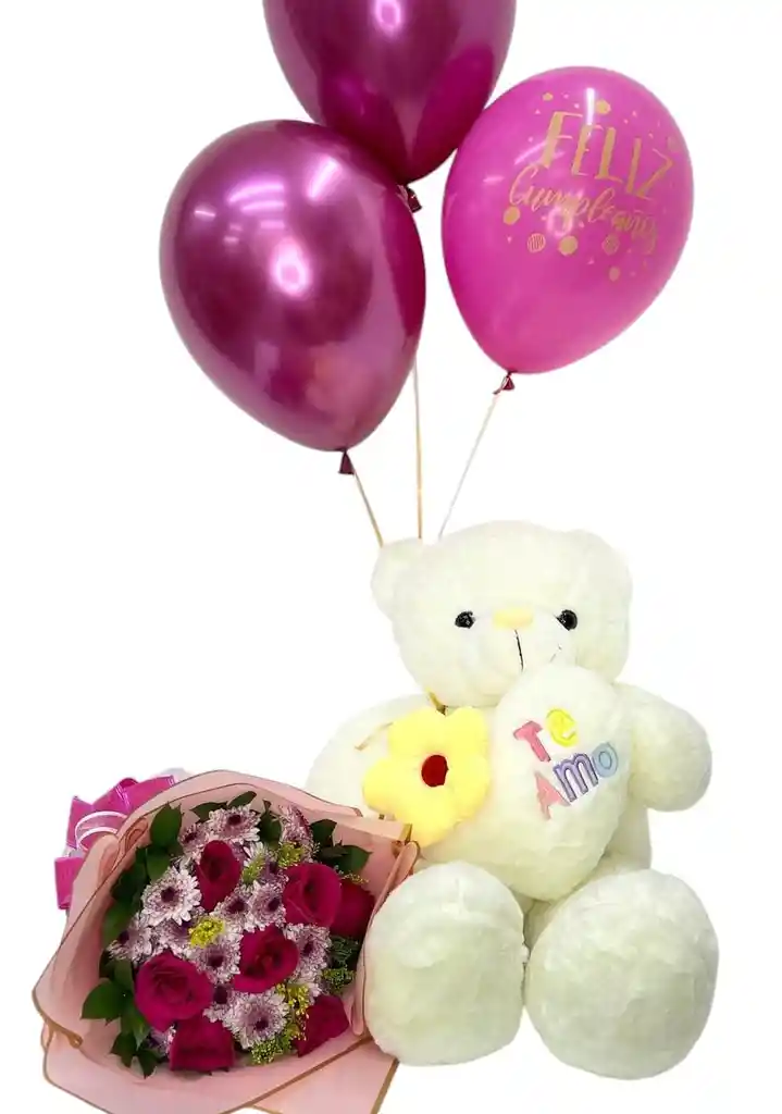 Hermoso bouquet de margaritas y rosas acompañadas por un peluche mediano y globos para decorar, un detalle perfecto para cualquier ocasión