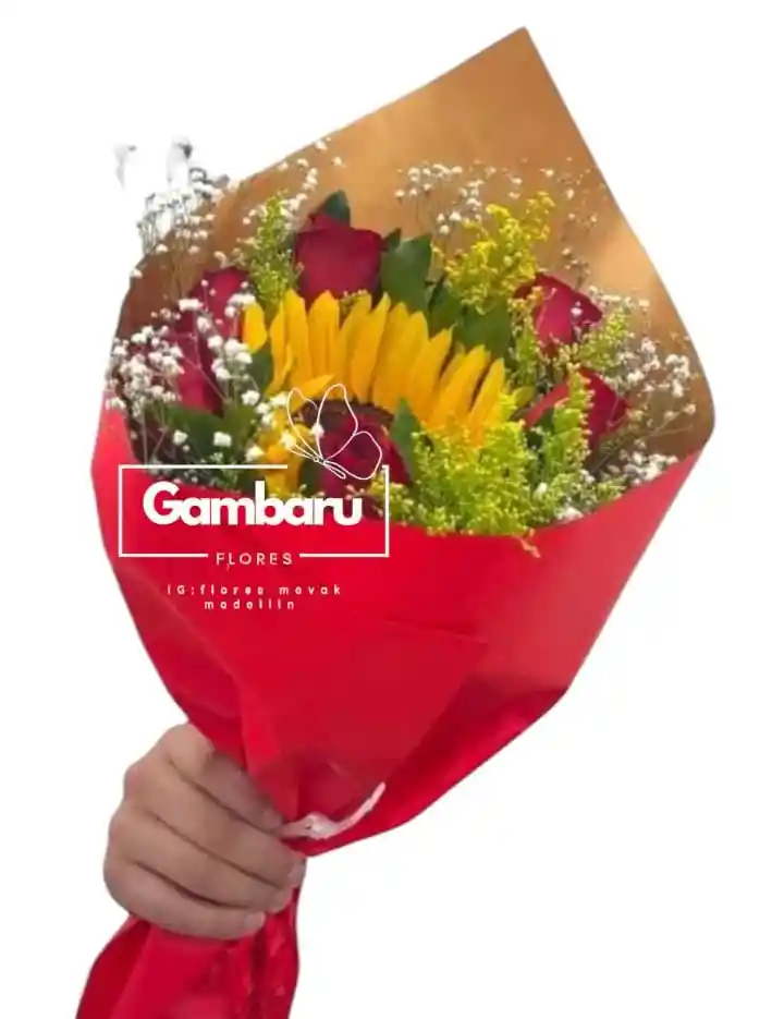 Hermoso bouquet de rosas rojas y girasol, un detalle perfecto para cualquier ocasión