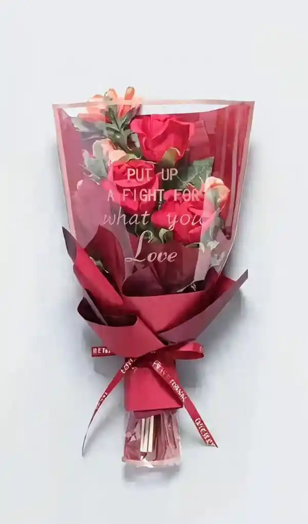 Hermoso bouquet floral compuesto por 6 rosas rojas frescas acompañadas de claveles y follaje decorativo, envuelto en papel premium rojo que resalta la elegancia y el romanticismo del arreglo. Un detalle perfecto para expresar amor, sorprender a alguien especial o celebrar un momento importante. Su presentación moderna y delicada lo convierte en un regalo ideal para cualquier ocasión.