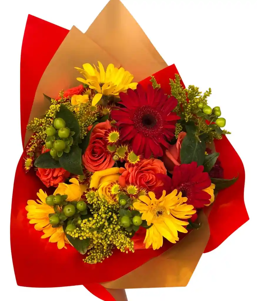 Flores variadas en tonos rojos y amarillos, omo gerberas, lirios y margarita. Papel decorativo premium, moño artesanal y fino follaje. Personalización: Si deseas agregar una tarjeta con mensaje o remitente, por favor escríbelo en la sección de "Comentarios" al realizar tu pedido o indícalo por el chat a tu Rappitendero.
