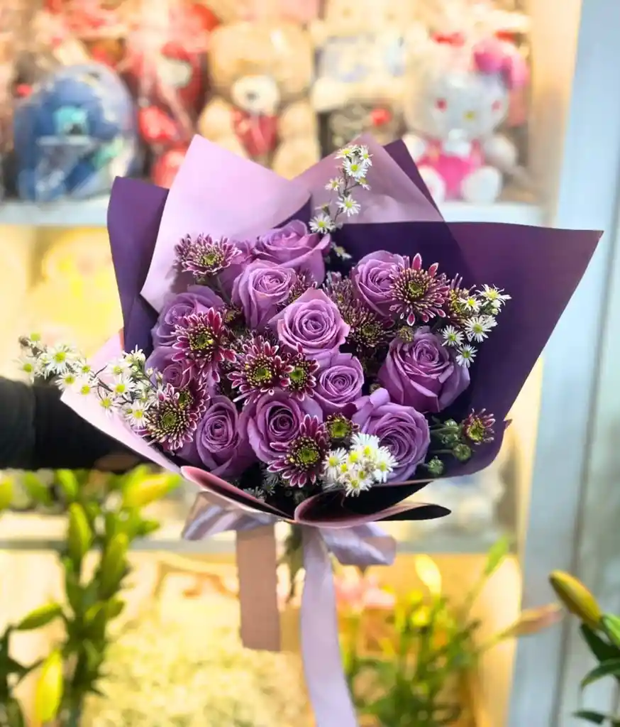 Flores en tonos morados como rosa y margarita. Papel decorativo premium, moño artesanal y fino follaje. Personalización: Si deseas agregar una tarjeta con mensaje o remitente, por favor escríbelo en la sección de "Comentarios" al realizar tu pedido o indícalo por el chat a tu Rappitendero.