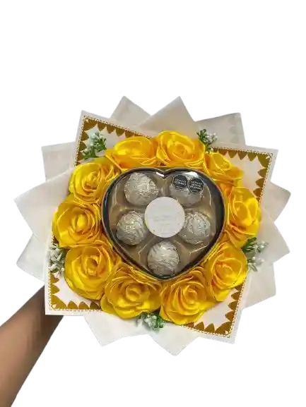 10 rosas eternas (elaboradas en tela satin) + estuche corazón Tresor x5 chocolates + tarjeta personalizada