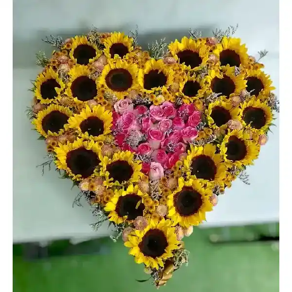 Arreglo en forma de corazón con girasoles y rosas rosadas en la mitad