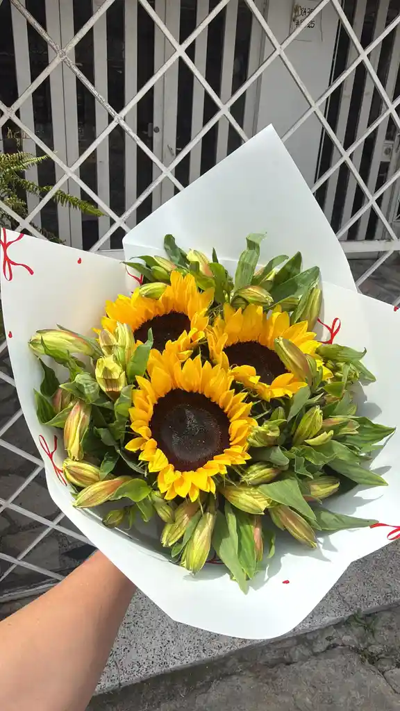 IMAGEN GUIA: Un diseño floral de alto impacto visual. La estructura imponente de 3 girasoles de tallo firme se entrelaza con la sutileza de 1 astromelia, creando un contraste moderno y equilibrado. Ideal para quienes buscan un arreglo floral llamativo, fresco y con una estética impecable. ( COLOR DE PAPEL Y ASTROMELIA PUEDE VARIAS SEGUN DISPONIBILIDAD)