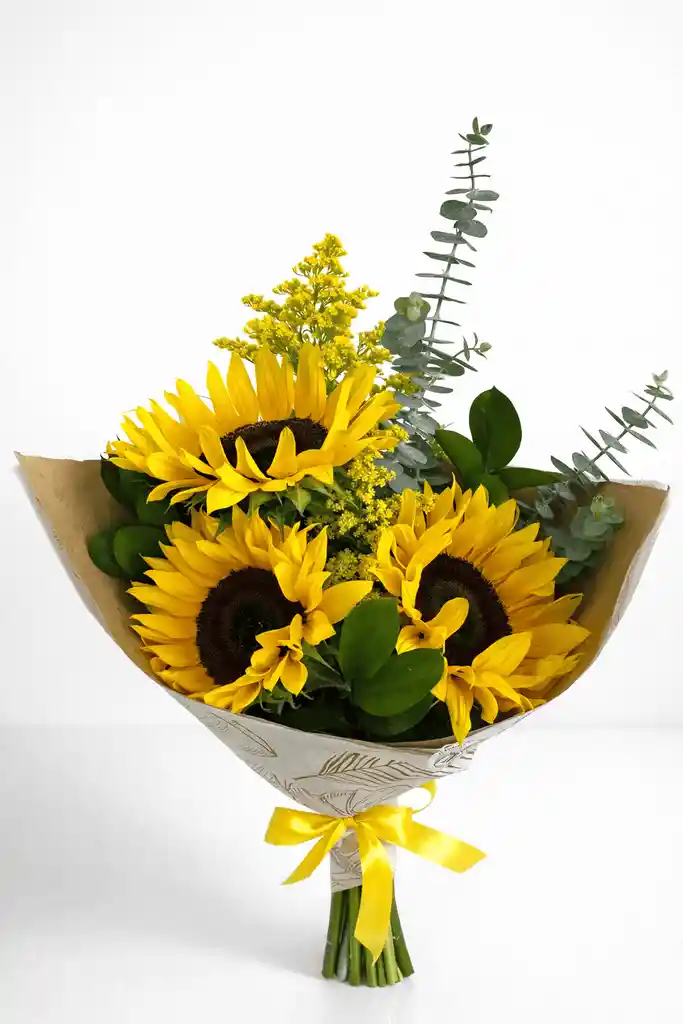 Hermoso bouquet de tres girasoles con rusco, eucalipto y solidago. Imagen de referencia, puede tener variaciones.