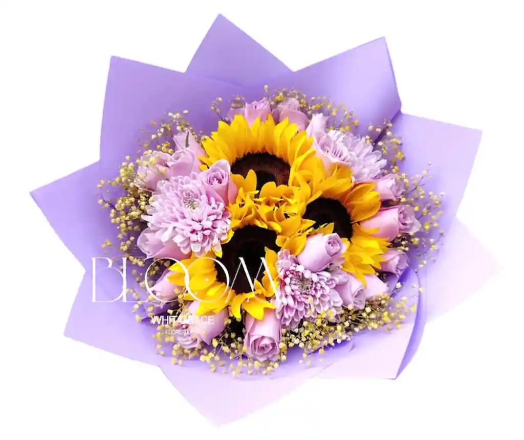 Hermoso bouquet de girasoles con una perfecta combinación de rosas lila, un detalle ideal para esa ocasión especial