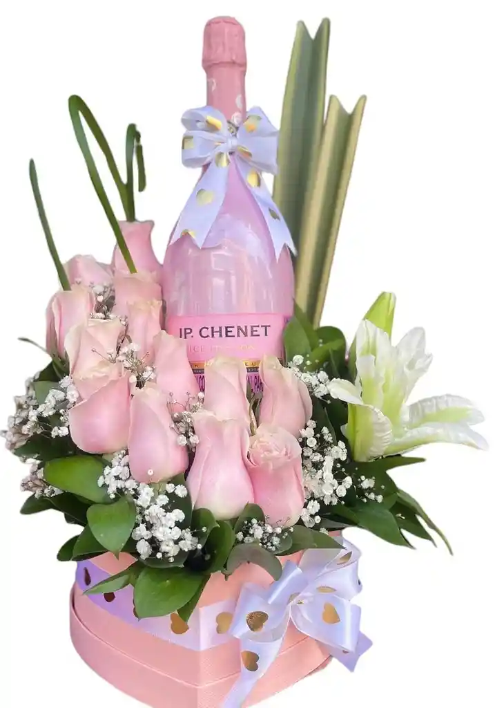 Hermoso cilindro de rosas rosadas en espiral acompañadas por una irresistible botella pequeña de Jp chnet, un detalle perfecto para cualquier ocasión