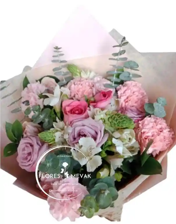 Hermoso bouquet de flores en tonos rosados, claves rosados, rosas lila, un detalle perfecto para cualquier ocasión