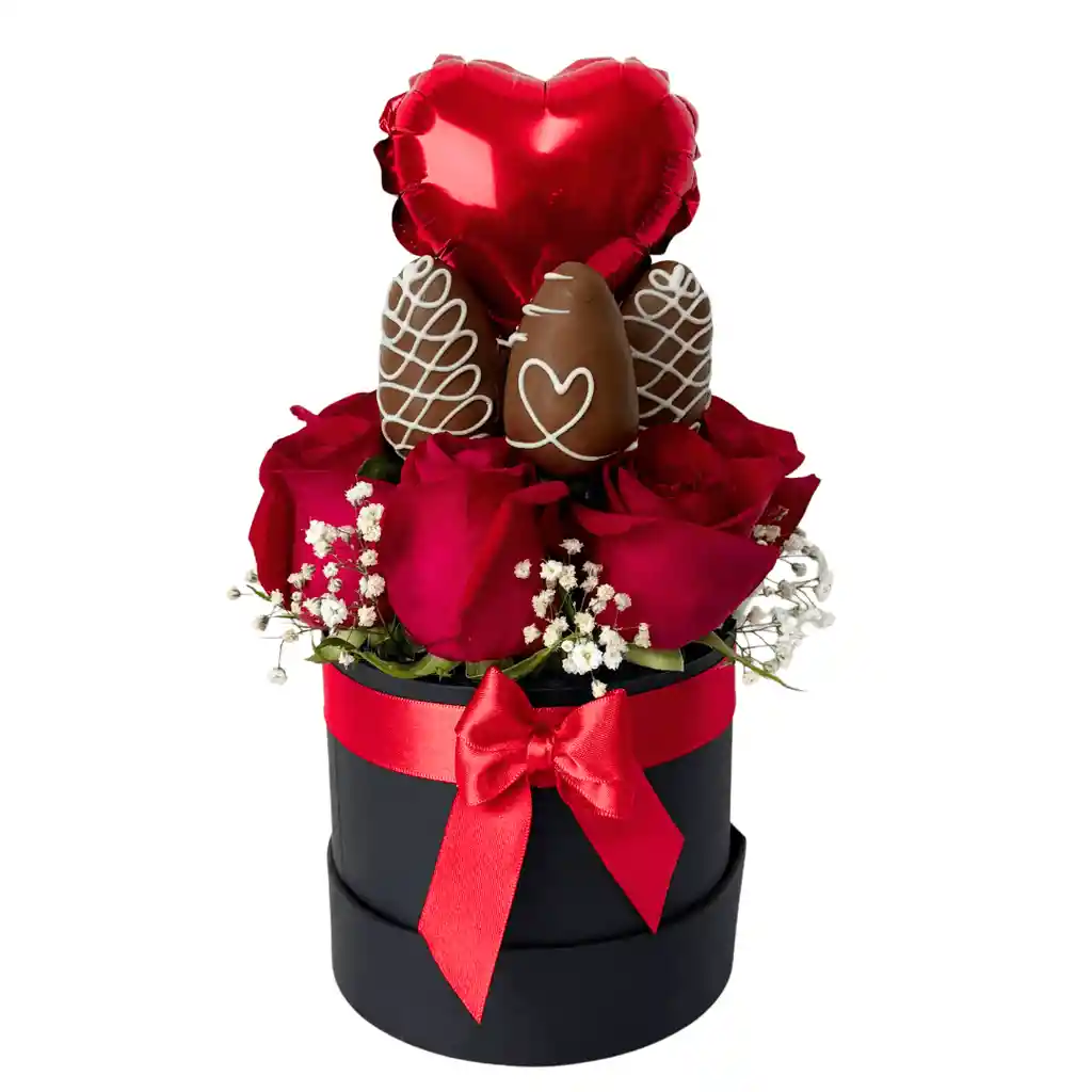 Un regalo encantador que combina la frescura de las flores con la dulzura del chocolate 🌹🍓✨. Incluye un cilindro decorativo con rosas frescas, follajes naturales y fresas cubiertas con chocolate, acompañado de un globo de 5" y un lazo elegante que realzan su presentación. Si nos envías tu mensaje, te obsequiamos la tarjeta personalizada para expresar tus sentimientos de manera única. REF: BOX03