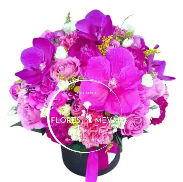 Hermoso arreglo en cilindro con rosas lila, claveles morados y orquídeas moradas, un detalle ideal para cualquier ocasión