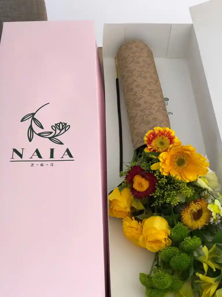 Flores Naia - Bouquet Alegría: Es un arreglo floral de 25 tallos de flores naturales, con 12 variedades diferentes (Crisantemo, Rosa, Astromelia, Gerbera, Pompona, Clavel, Boca de Dragón, Craspedia, Manzanilla, Boton de Oro, Pinoquio y Solidago. Son Flores Amarillas, intencionadas para que llenen tus espacios y tu alma de alegría, optimismo, originalidad, inteligencia, riqueza, lujo y bienestar. Son perfectas para celebrar la armonía pura y entusiasmo por disfrutar de la vida. Vienen en una caja de lujo, con un incienso, tarjeta personalizada y alimento floral.