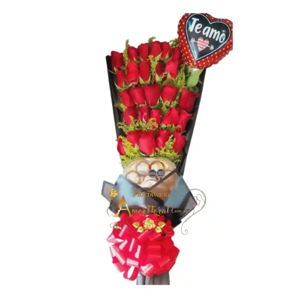 bouquet de rosas por 24 unidades, chocolate ferrero por 8 unidades, con papel decorativo, moño y tarjeta con mensaje, si deseas un mensaje para la tarjeta lo puedes dejar escrito en el área de observaciones o escribirnos al whatsapp al 3143111616 y enviarnos el mensaje para la tarjeta.