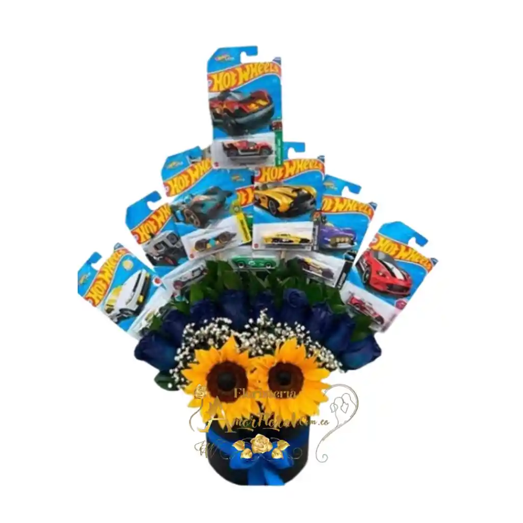 cilindro de rosas y girasol, 8Carros Hot Wheels, moño y tarjeta con mensaje, si deseas un mensaje para la tarjeta lo puedes dejar escrito en el área de observaciones o escribirnos al whatsapp al 3143111616 y enviarnos el mensaje para la tarjeta.