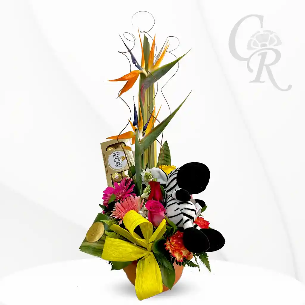 Diseño floral en base, elaborado en variedad de flores, con chocolates Ferrero x 8 unidades y peluche (puede variar según disponibilidad)