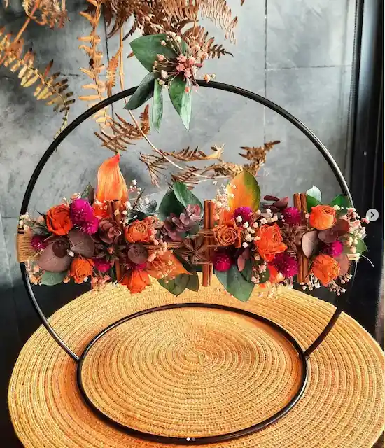 Aro metálico negro con arreglo central entre calado de Yute y Flores Naturales Secas y Preservadas. Medidas: 30cm x 28cm. NOTA: Pedidos con 2 Días de Antelación