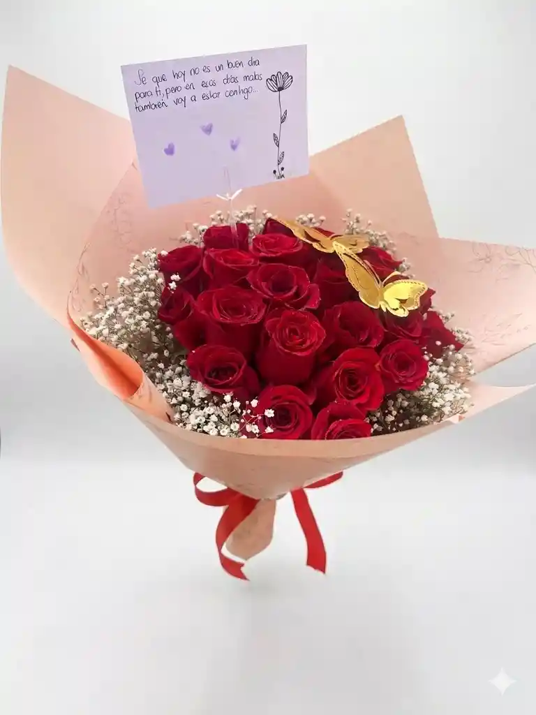 24 rosas rojas y jipsu blanco y Mariposa a envíos express e en Bogotá ideal para cumpleaños apoyo y amor