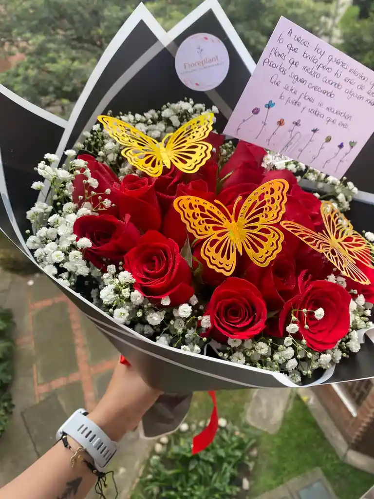 24 rosas rojas y jipsu blanco y Mariposa a envíos express e en Bogotá ideal para cumpleaños apoyo y amor