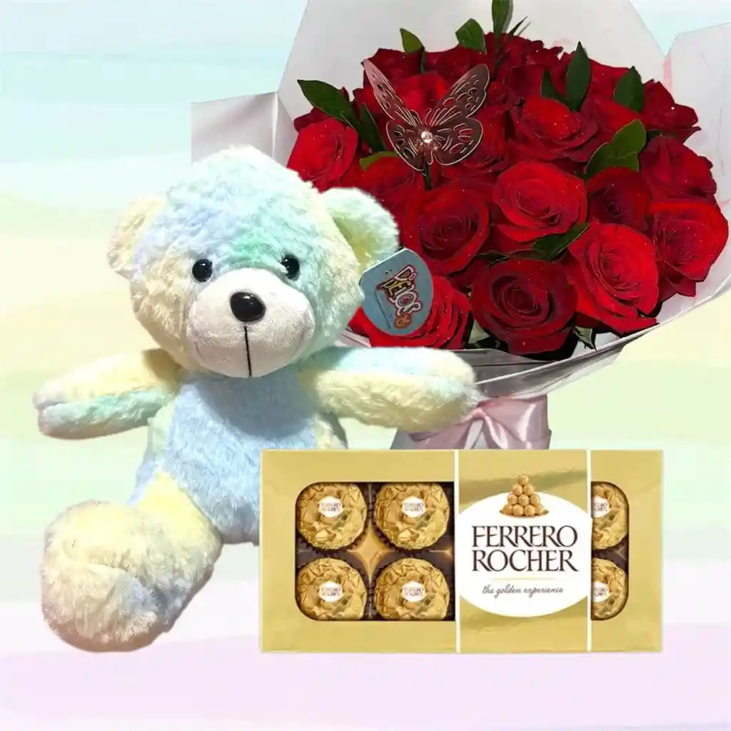 Un osito multicolor azul suave y adorable 🐻💖, acompañado de un bouquet de 24 rosas 🌹 y 8 Ferrero Rocher 🍫. Perfecto para regalar y sorprender con ternura y sabor. ✨