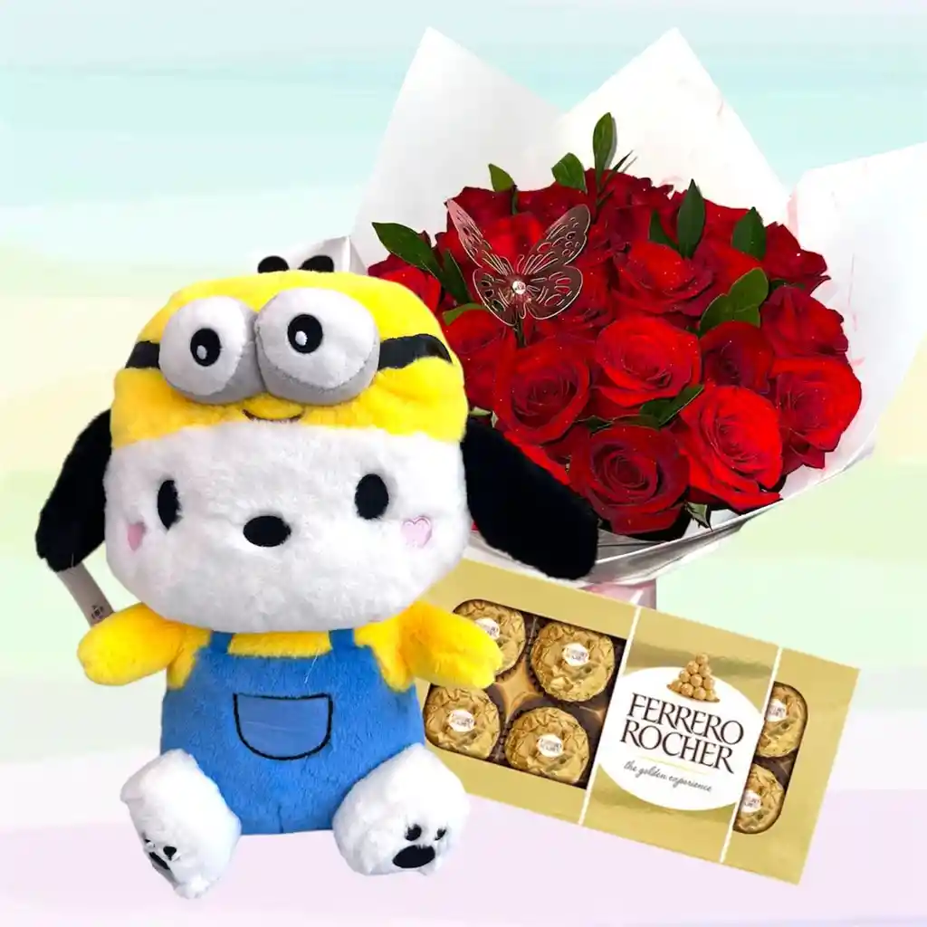 Un regalo tan inesperado como encantador. Este set incluye un divertido peluche de Snoopy en versión Minion, una caja de Ferrero Rocher y un bouquet de rosas frescas, logrando una mezcla perfecta de risa, dulzura y romanticismo. Ideal para sorprender con algo fuera de lo común pero lleno de cariño.