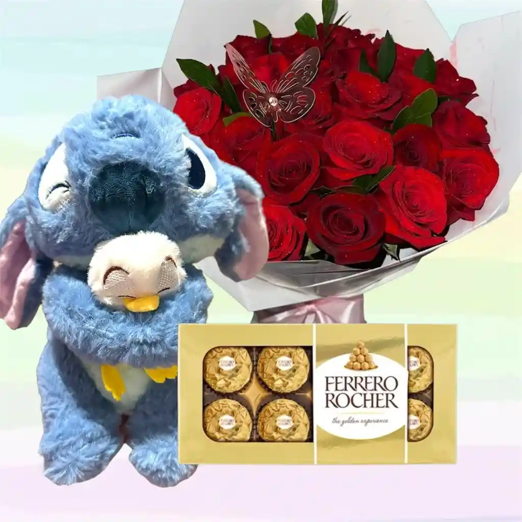 Un peluche Stitch con patito 🐾💙, acompañado de un bouquet de 20 rosas 🌹 y 8 Ferrero Rocher 🍫. Perfecto para sorprender en cualquier ocasión especial con amor y diversión. 💝✨