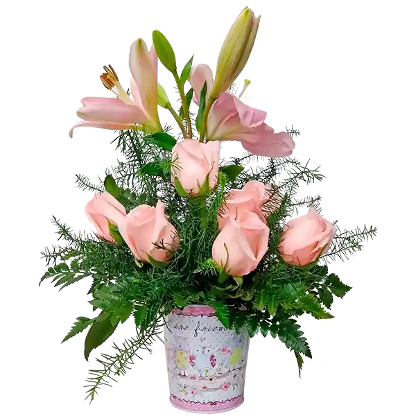 Mini arreglo en rosas rosadas, lirios, follaje en helecho cuero, trifer.