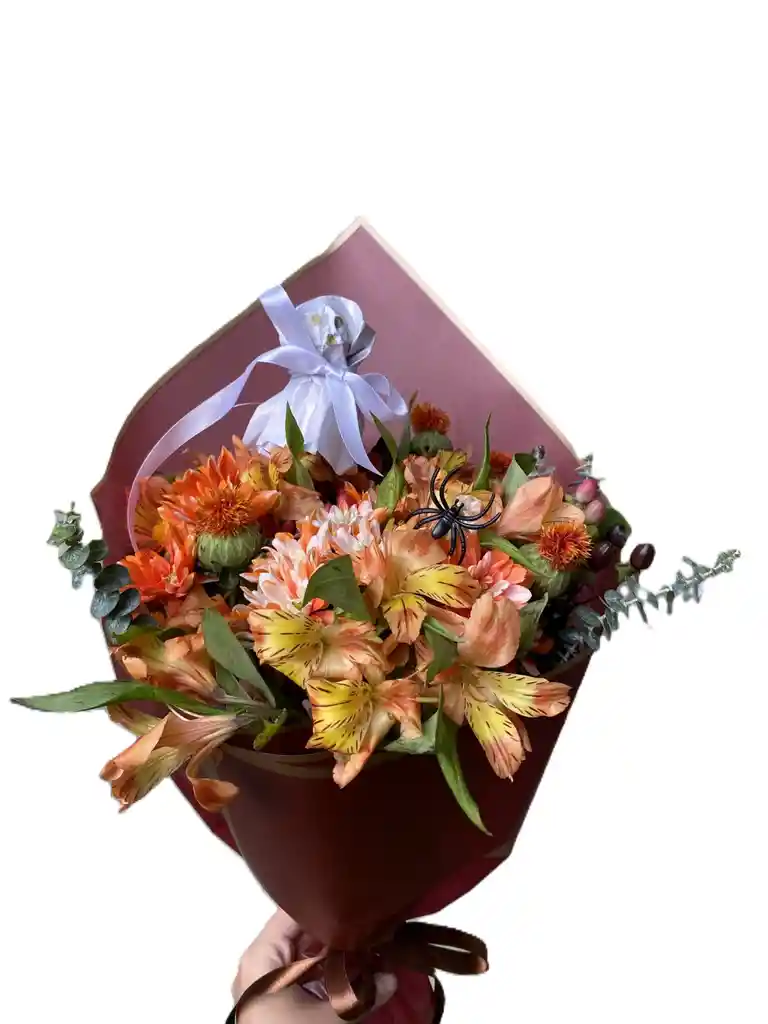 flores surtidas en tonos naranjas, amarillos y rojos decorado con una araña y un ferrero disfrazado de fantasma la envoltura en papel coreano y lazo sencillo, el color del papel puede variar segun disponibilidad si deseas dejar un mensaje puedes escribirlo en el chat del rt que se activa al momento de ser asignado IMAGEN DE REFERENCIA