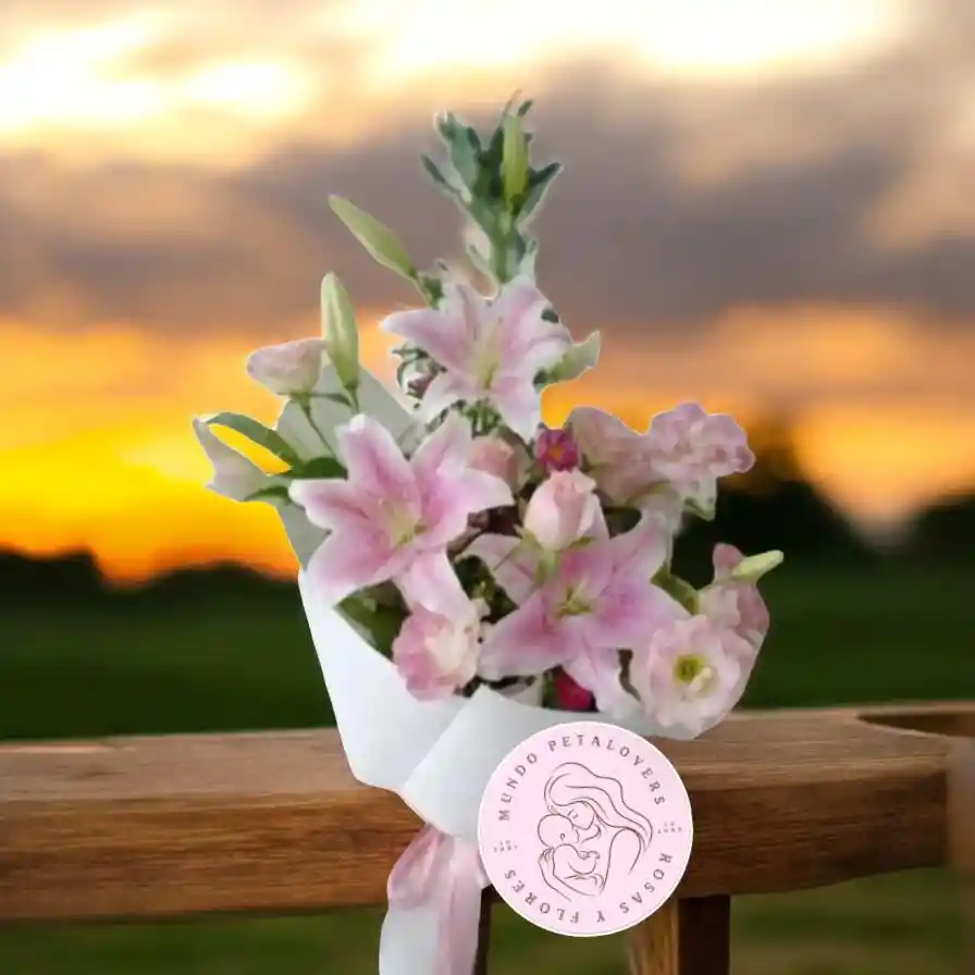 Este exquisito arreglo floral combina la elegancia de 6 lirios con la frescura de las margaritas y el encanto de 3 rosas rosadas. Perfecto para celebrar la primavera o alegrar cualquier ocasión especial con su mezcla de colores y fragancias naturales. PETALOVERS"
