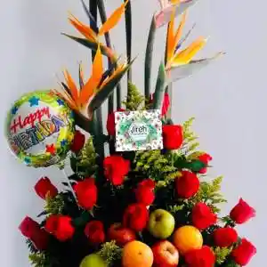 Diseño exclusivo con rosa tipo exportación, aves del paraíso, Follajes verdes, frutas, globos metálico mediano, base de madera exclusiva y tarjeta impresa con mensaje personalizado.