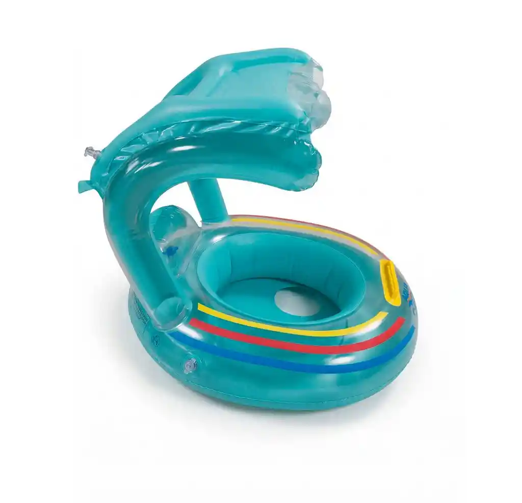 Este flotador infantil es la solución ideal para que los más pequeños disfruten del agua con total seguridad y confort durante sus primeras experiencias en la piscina. Diseñado en un llamativo color turquesa con franjas decorativas, integra un práctico techo inflable que proporciona una sombra efectiva, protegiendo la delicada piel del bebé de la exposición directa al sol. Su estructura ergonómica cuenta con un asiento tipo pañal de orificios reforzados, un respaldo inflable que garantiza una postura cómoda y un asa frontal de agarre para mayor estabilidad. Fabricado en PVC de alta resistencia y durabilidad, este flotador unisex es el accesorio perfecto para vacaciones, ofreciendo un soporte confiable mientras el bebé explora el entorno acuático de forma divertida y segura. Ficha Técnica: Género: Unisex Material: PVC de alta resistencia Dimensiones totales: 56 cm de largo x 58 cm de ancho Altura total: 70 cm (incluyendo techo) Tipo de inflado: Válvulas de seguridad independientes Edad recomendada: + 3 años Peso máximo soportado: 15 kg Características adicionales: Techo protector solar, respaldo integrado y manija de agarre frontal. Políticas de Garantía: La garantía de este producto es de 30 días a partir de la entrega y cubre exclusivamente defectos de fabricación en costuras o válvulas. Al tratarse de un artículo inflable, la garantía no será válida si el producto presenta pinchaduras, rasgaduras o daños ocasionados por mal uso, sobreinflado o contacto con superficies punzantes. Para hacer efectiva la garantía, el producto debe devolverse en su empaque original y sin señales de uso indebido. Es indispensable que el uso del flotador se realice siempre bajo la supervisión constante de un adulto responsable, ya que este producto no es un dispositivo salvavidas.